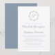 Este elegante design de convite de casamento apresenta um monograma empoeirado de escrita azul rodeado por uma coroa botânica de arte de linha. Os nomes aparecem em um script azul empoeirado, com o resto do texto na fonte serif clássica. A parte traseira da placa é azul empoeirado sólido.
