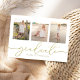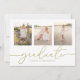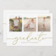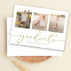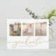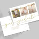 Este design apresenta um simples modelo de convite para apresentação de duas fotografias, um anúncio elegante de três imagens para três formandos, com uma caligrafia simples moderna, tipografia de gráficos de tendências, excelente para segundo grau ou vertical universitário, um convite para o formando de graduação, um design minimalista para o mais velho, excelente celebração de parabéns, com texto dourado e fundo branco, e uma letra de escrita de rico