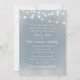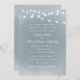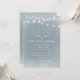 Convites de casamento de cor azul-poeirenta com luzes de cordas brancas e uma letra elegante em todo o convite.