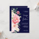Este elegante convite de casamento floral azul e cor-de-rosa, marinho escuro, apresenta flores cor-de-rosa, verde e outros elementos florais e caligrafia manuscrita de na moda num fundo de marinho rico e temperado. Este convite é perfeito para o casal ter seu casamento em um local de casamento romântico, formal, elegante, moderno, chic, sofisticado, rústico, de moda ou ao ar livre.