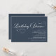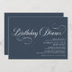 Convites de janto de aniversário formais com a menção "Janto de aniversário" em um roteiro de caligrafia estilo vintage. Os detalhes do evento estão no canto inferior direito. Texto branco sobre fundo azul escuro.