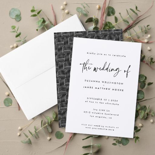 O convite para Casamento Semimodulável, Moderno e Mínimo, de Preto e Branco, com "o casamento de" em um roteiro de caligrafia manuscrito contemporâneo e um padrão geométrico moderno no verso - todas as cores podem ser alteradas usando a ferramenta design. A papelaria de casamento adicional está disponível no meu compro, apenas navegue na coleção e construa o seu convite de casamento.