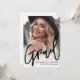 Convite de Formatura e Festa Minimalista Simples. A frente apresenta uma foto em página inteira com "Grad" em letra cursiva preta na parte inferior. Abaixo dela, o nome do graduado, "Turma de 2026" e o nome da escola são exibidos sobre um gradiente branco sutil que se funde perfeitamente na imagem, garantindo que o texto se destaque.
