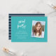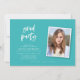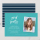 Convite de festa de formatura com foto estilosa apresentando sua foto em uma borda branca e "Festa de Formatura" em letra cursiva da moda contra um fundo turquesa na frente e um padrão de listras azuis e brancas no verso.