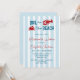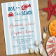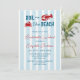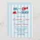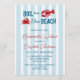 Boil on the beach! Seafood boil bachelorette weekend with a crab and lobster against a coastal blue striped background