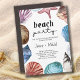 House Warming Beach Convite de festas, enquadrado com conchas de água e criaturas oceânicas. A expressão "festa de praia" é escrita à mão e o texto restante é perfeitamente editável.