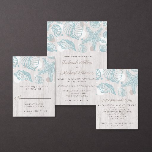 A recepção de praia de madeira branca de Seashell apenas convida com um design de madeira branca rusticado com um esquema de cor azul e bronzeada, com uma ilustração do contorno de conchas ao longo do topo. Seus detalhes personalizados de casamento e recepção são impressos em castanho e bronzeados sobre o fundo de madeira branca. Esta recepção de concha só os convites de casamento são perfeitos para as comemorações de casamento poste na praia. Estão disponíveis placas RSVP correspondentes e outros itens.