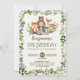 Convite para segundos aniversários de trigo com ilustração de verduras, folhagem e adoráveis animais florestais: raposa, veado, urso e guaxinim