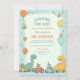 Um design de aniversário de dinossauros lúdico e colorido com dinos bonitos dirigindo carros de corrida, balões e decorações de festas. Perfeito para uma divertida comemoração do segundo aniversário com um tema de corrida de dino.