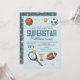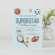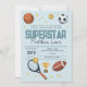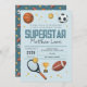 Este design de convite para segundos aniversários de rapazes giros e modernos apresenta um design de animação desportiva super-estrela azul, com basquete, futebol, bola de futebol, raquete tênis, troféu e estrelas. O convite pode ser personalizado com o nome do seu filho e outros detalhes necessários para o seu partido, e também pode ser editado para outras idades. O esporte perfeito temia a adição ao aniversário do seu filho!