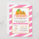 Pequenos e modernos convites para o segundo aniversário. Apresentando riscas brancas e cor-de-rosa diagonal, borda clara dourada falsa e abóboras cor de água laranja. Um convite para uma festa de aniversário do tema do outono.