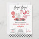 Carro Vermelho Balões Elefantes Convite para segundo aniversário de Elefante Um convite de aniversário de corridas de garotinho fofo com um carro de corrida vermelho, elefante fofo, balões vermelhos e bandeiras. Este convite rápido de aniversário também apresenta um padrão verificado preto-e-branco e texto moderno de caligrafia. Excelente para o carro de corridas vermelhas de um menino no segundo aniversário.