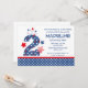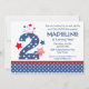 Um design de segundos aniversários bonito personalizado em 4 de julho com um grande fogos de artifício azul número dois cheios de estrelas vermelhas e brancas e estreladas por estrelas. Texto personalizável. Perfeito para o segundo aniversário de 4 de julho! PinkInkArt original!