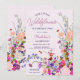Nossa flor silvestre está virando 2! Ilustração elegante das flores primavera de verão, com bonito flor e rolo silvestre, segundo aniversário com uma tipografia caligráfica moderna, com flores vermelhas, roxas, cor-de-rosa, terracotta.
