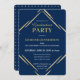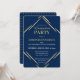 Comemore sua graduação em 2025 com a família e amigos com este elegante convite à festa de formatura de ouro azul. Este design apresenta um estilo formal em azul escuro e ouro com sotaques geométricos dourados.