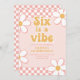 Seis é um clima de garota Groovy convite de aniversário de 6 anos inspirado no estilo retrô com fontes dos anos 70 e margaridas e padrão de xadrez.