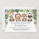 Celebre a chegada da sua pequena selvagem com este convite para chá de fraldas de safari caprichoso. O design apresenta um grupo de adoráveis animais da selva e um verde-aquarela tropical em verde e ouro.