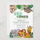 Seus gêmeos estão virando um? Este design Wild One é perfeito para o seu primeiro aniversario. O tema safari da selva mostra um desenho ilustrado: macaco, preguiça, elefante, leão e girafa! Festa com este design verde folha!