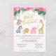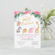 Ter um chá de fraldas/chá virtual por e-mail? Celebre a garotinha a caminho com estes adoráveis convites para o chá de bebê safari "somos selvagens com entusiasmo"! Os bebês-animais doces, emparelhados com folhas tropicais, texto dourado, flores tropicais cor-de-rosa e sotaques cor-de-rosa, são perfeitos para chás de bebês. Com macaquinho giro balançando na vinha, zebra stripey, leão giro, elefante aspergaminho e girafa curiosa. Fácil de adicionar seus próprios detalhes, detalhes da reunião do plano de festa e endereço de correio de presente para um chá virtual super divertido "selvagem com entusiasmo"!