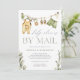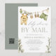 Adorável safari temático de convites para bebês com uma doce vibração boho apresenta uma faixa de roupas de corda com um cortador de aquarelas, calções, calçados e um leão enfeitado com folhas da selva tropical. "Chá de fraldas Por Correio" aparece abaixo em cinzas e script manuscrito verde e letra de serifa clássica. Personalize com os detalhes do seu chá de fraldas abaixo e adicione o código QR do seu registro às costas.