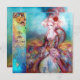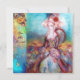 Design elegante, colorido, sofisticado e caprichoso em cores vibrantes, fúcsia, azul-turquesa, branco. Linda mulher sofisticada de cabelo loiro esbranquiçado, tecidos azuis e rosa dourado cintilante de um traje barroco com penas e uma rosa vermelha. Pintura original em aquarela e acrílico com folha dourada e cores iridescentes em tela. Este cartão legal e artístico é perfeito para casamentos, cerimônias nupciais, chás de noiva, festas de 16 anos, festas de quinceañera, bailes à fantasia, noivados românticos, anúncios de "save the date", Natal, festas de Natal no escritório, reuniões de família, coquetéis, celebrações de Ano Novo, aniversários, encontros, concertos, recitais ou qualquer outro evento que você deseje.