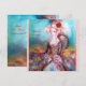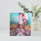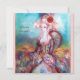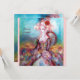 Design elegante, colorido, sofisticado e caprichoso em cores brilhantes, fúcsia, azul-turquesa, turquesa e branco. Linda mulher sofisticada de cabelo loiro esbranquiçado, tecidos dourados cintilantes azuis e rosados de um traje barroco com penas e uma rosa vermelha. Pintura original em aquarela e acrílico com folha de ouro e cores iridescentes em tela. Este cartão legal e artístico é perfeito para casamentos, cerimônias nupciais, chás de noiva, festas de 16 anos, festas de aniversário de quinceañera, bailes de dança com fantasias, compromissos românticos, anúncios de "save the date", Natal, festas de escritório, reuniões de família, coquetéis, celebrações de Ano Novo, aniversários de casamento, encontros, concertos, recitais ou