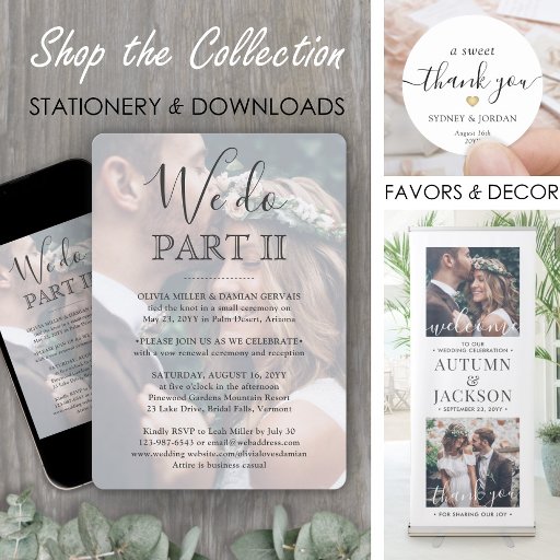 Convide familiares e amigos para testemunhar que você diz "Eu faço" novamente com um elegante convite de casamento de 2 textos fotográficos. Toda a formulação é simples de personalizar, incluindo a citação que diz "nós fazemos parte II." Personalize-o para qualquer tipo de celebração de casamentos, como uma cerimônia de renovação de votos, uma recepção de aniversário de 1rua, um partido de elopeamento poste, hora de cocktail ou um grupo de janto. Personalize com os detalhes de sua escolha, incluindo data do casamento, rsvp, código de vestimenta, site, etc. (DICA DE IMAGEM: Uma maneira fácil de centralizar uma foto exatamente como você deseja é recortá-la antes de carregá-la no site do Zazzle.) O moderno minimalista design a preto e branco apresenta duas imagens do novo casal, a caligrafia tradicional escrita à mão e a tipografia de estilo de máquina gráfica. Se fugiu ou não devido à pandemia cobiçada ou se desceu para um menor, mais íntimo minimônio ou microcasamento, o feliz para sempre depois da festa ainda pode começar. Parabéns para a noiva e o noivo!