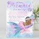 Chá de fraldas a longa distância por convite para chás de fraldas de correio com adorável sereia bebê africana com bonito cauda rosa numa bela cauda rosa, roxa e azul-rosa da sereia e sob fundo do mar. Este convite para chá de fraldas de sereia é facilmente personalizado com seus detalhes.