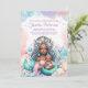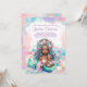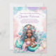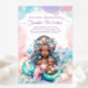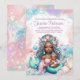 Convites de baby shower de sereia africana com linda mãe sereia segurando um doce bebê em um lindo fundo de bolhas pastéis e conchas. Este convite de baby shower de sereia pode ser facilmente personalizado para o seu evento, basta adicionar seus detalhes. Você também pode adicionar uma cor de fundo na frente e atrás.