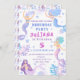 Faça um salto com este mágico Convite de Aniversário para 5 de Sereia! Apresentando ilustrações de cor d'água pastel de sereias, corais e estrelas-do-mar, esta design de temática submarina é perfeita para o dia especial da sua menina. A fantástica paleta de púrpura, blues e pinks adiciona um toque caprichoso, enquanto as fontes elegantes destacam o nome e os detalhes de aniversário do seu filho. Personalize-o facilmente com as informações da sua festa. Ideal para uma festa de piscina de verão, um bash de praia ou uma celebração temerária de sereia!