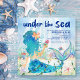 Enquanto o chá de panela do tema do mar apresenta uma sereia de aquarela descendo no oceano com alguns amigos de peixes, desfrutando das miras de recifes de coral e uma bebida tropical com uma legenda "Sob o Mar" em letras violetas do estilo pincelada azul. Arte por KL Stock
