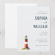 This elegant wedding invitation features a minimalist layout with ample negative space, creating a serene and inviting atmosphere. The design showcases a charming watercolor lighthouse illustration in red, white, yellow, and green hues, adding a touch of whimsy to the modern aesthetic. The typography is clean and sophisticated, with bold sans-serif fonts for names and a mix of serif styles for additional details. Perfect for couples seeking a stylish yet understated look, this invitation captures the essence of a coastal theme while maintaining an airy and open feel.