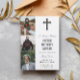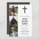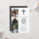 Convite funerário em branco com uma cruz de cinza e fontes de cinza elegantes personalizadas com três fotos. Convite para enterro de fotos em branco e cinzas com cruz.