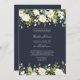 Um convite elegante para um serviço de memorial funerário em azul marinho, com embelezamentos florais de cor aquosa branca. Copyright Elegant Invites, todos os direitos reservados.