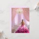 Um belo salão de baile com uma garota adolescente vestindo um lindo vestido rosa e branco, rufflado. A sala é decorada com cortinas cor-de-rosa, mesa elegante e cadeiras para hóspedes, candelabro cintilante, luzes brilhantes bonito. A parte de trás da carta tem fadas lindas e delicadas. Personalize com suas informações de festa, nome de garotas etc.