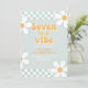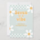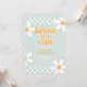 Sete é um Convite de Aniversário de 7 anos Groovy Girl inspirado em Retro com fontes estilo anos 70 e margaridas e padrão xadrez.
