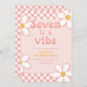 Sete é um Clima Garota Groovy Convite de aniversário de 7 anos inspirado no retro com fontes estilo anos 70 e margaridas e padrão de xadrez.