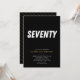 Este elegante e sofisticado design de 70 de aniversário preto e ouro apresenta a palavra "setenta" em um conjunto de caracteres ousado e elegante contra um fundo preto elegante. O sotaque dourado adiciona um toque de luxo e sofisticação. O layout simples facilita a leitura e a compreensão. Este convite é perfeito para o aniversariante ou menina que quer comemorar seu dia especial de estilo. É também uma escolha excelente para os pais que querem enviar um convite sofisticado à festa de aniversário de 70 do seu filho.