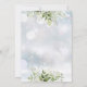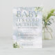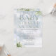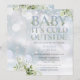 Um convite elegante para o chuveiro de bebê de inverno, apresentando uma tipografia azul elegante empoeirada e folhagem botânica bonita em um fundo de flocos de neve de inverno. Criado por Thisisnotme©