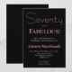 Seventy and Fabulous script minimal blush pink on a black background modern 70th birthday invitation that you can personalize and send out for your seventieth birthday party celebration. The words "Seventy and Fabulous" are set using popular script font typography. The text colors can be changed using the edit menu.