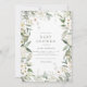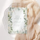 Nosso convite floral elegante e rústico para verde apresenta uma combinação fluida de tipografia serif e sans serif, folhagem verde-menta pintada manualmente e flores brancas altamente detalhadas em um arranjo de coroa. Crie um tema de chá de fraldas elegante, chique e sofisticado com essa coleção de produtos neutra em termos de gênero.