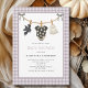 Sexo neutro do Halloween convite de chá de fraldas de linha de roupa. Design de diversão para um chá de fraldas de outono. Fácil de mudar o texto. Fundo de gingham roxo leve com linha de roupa de bebê. Fantasma bonito, morcegos e roupas de bebê.