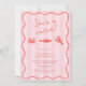 Whimsical hand-drawn Sea Life inspired Bachelorette Party weekend invitations featuring a squiggle border, and hand-drawn icons (lobster, crab etc, umbrella, bikini, beach bag). Shown here in blush pink and tomato red but all colors (stripes, background arch, icons, and of course font colors) can be customized by you from inside the design tool.