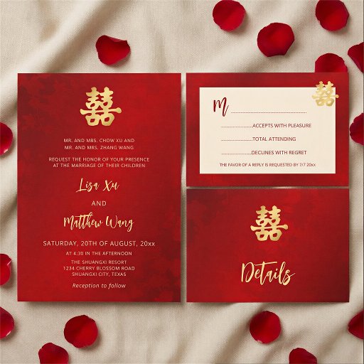 Esta versão tem uma manchete para anunciar o casamento dos pais da noiva e do noivo. Este elegante convite para o casamento chinês mostra um símbolo de dupla felicidade de ouro artístico em um fundo floral vermelho de shimmering. Nomes de noiva e noivo em um elegante roteiro escrito à mão. Convite para casamento chinês ou convite para cerimônia de chá.