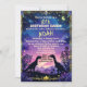 Silhuetas de dinossauros com um céu estrelado e uma lua brilhante em tema de dinossauros noturnos. Perfeito para crianças amantes de dinossauros para o convite de aniversário.