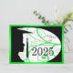 Uma silhueta de um jovem em seu boné e vestido. Designs florais no fundo. O fundo tem um fundo verde com letras negras para os convites para festas de formatura.