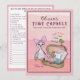 The front features a cute baby goose in a pink bow next to a suitcase overflowing with keepsakes like a toy, blanket, and lists, with space to personalize the birthday girl's name and the future opening date (e.g., "To be open 18 years after..."). The back lists 15 thoughtful items to include in the time capsule, such as "First Shoes," "Baby's First Words," and "A Lock of Hair," with additional blank lines for party guests to add their own creative suggestions. It's a wonderful way to involve guests in creating a piece of history!