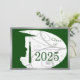 Uma silhueta de um jovem em seu boné e vestido. Designs florais no fundo. O fundo tem um fundo verde com letras brancas para os anúncios de graduação.