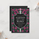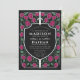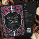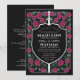 Convide seus convidados de casamento com esta espada real e escudo convite de casamento de monograma de fantasia medieval, com sotaques elegantes de prata e flores de burgundy contra fundo preto, com um código QR para seu site de casamento no verso. Esta design é perfeita para casais que procuram uma estética de fantasia medieval, mas real, moderna. Personalize o texto, a fonte e as cores para se adequarem às suas preferências de design. Correspondência de Itens em nosso compro para um tema completo de festa. NOTA: A prata representada nesta design NÃO é uma folha de alumínio real.