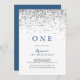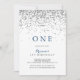 Este primeiro convite de aniversário minimalista de confete prateado é perfeito para uma festa de aniversário rústica. O simples e elegante design apresenta um confete prateado e uma tipografia clássica de rico em azul e preto.